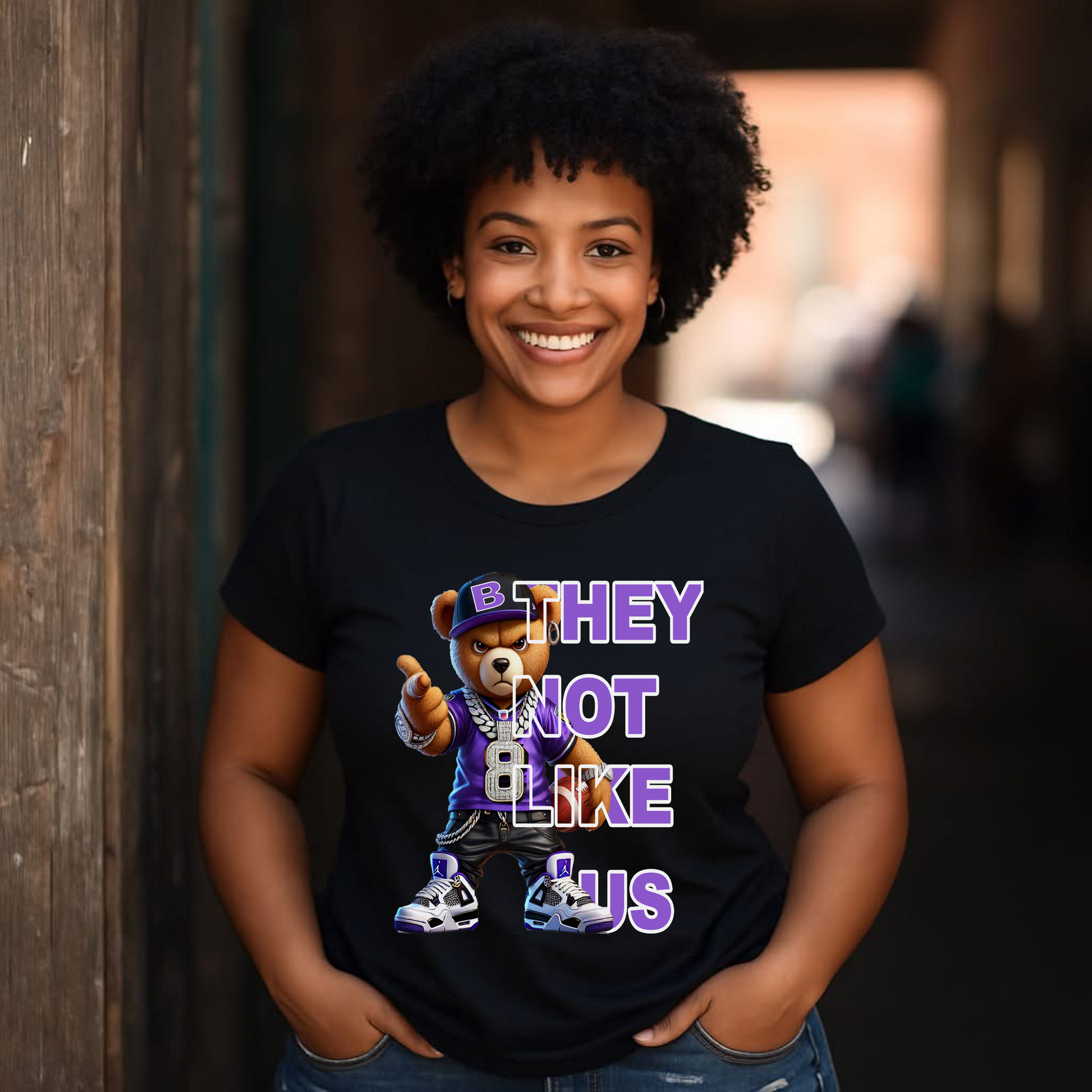 Step out bold and unapologetic with the They Not Like Us graphic tee. Featuring a drip-heavy bear rocking a fitted cap, iced-out chain, and retro sneakers, this shirt blends urban attitude with standout style. The design pops against the crisp white cotton, making it perfect for flexing with jeans, joggers, or layered under a jacket.